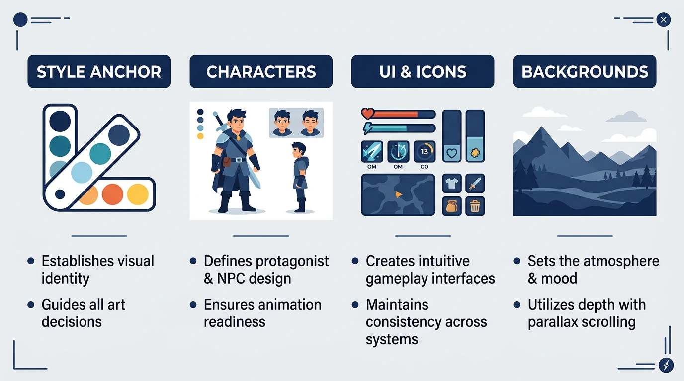 - Сгенерируйте персонажа первым — Главный герой определяет визуальный тон. Все остальные активы должны ссылаться на «тот же стиль, что и [описание персонажа]» в своих подсказках.