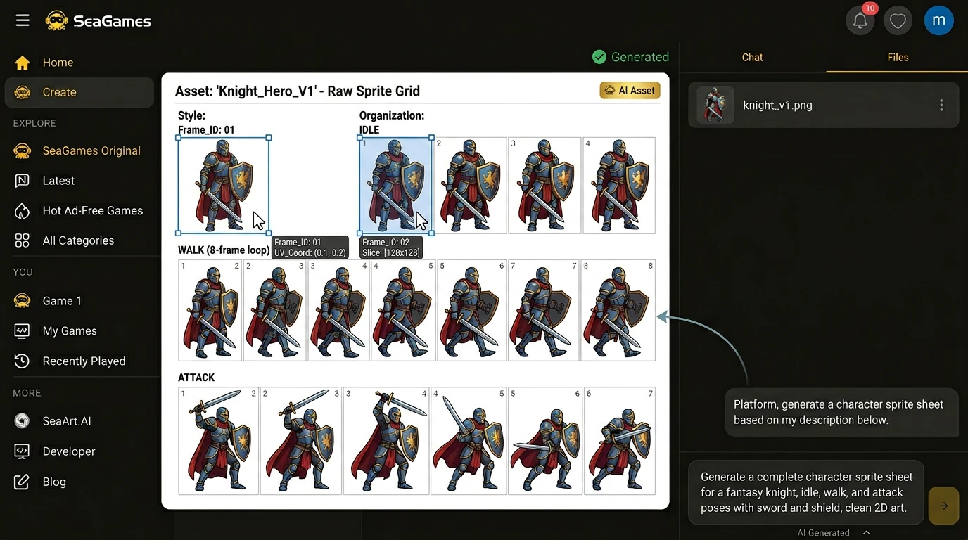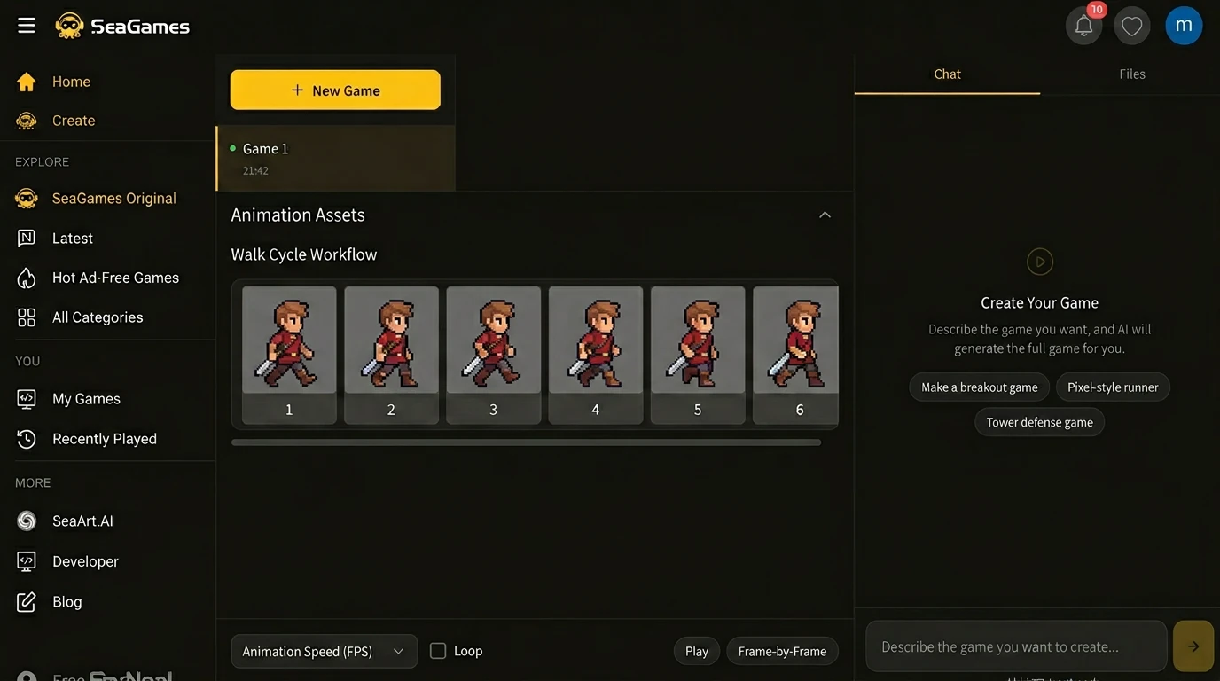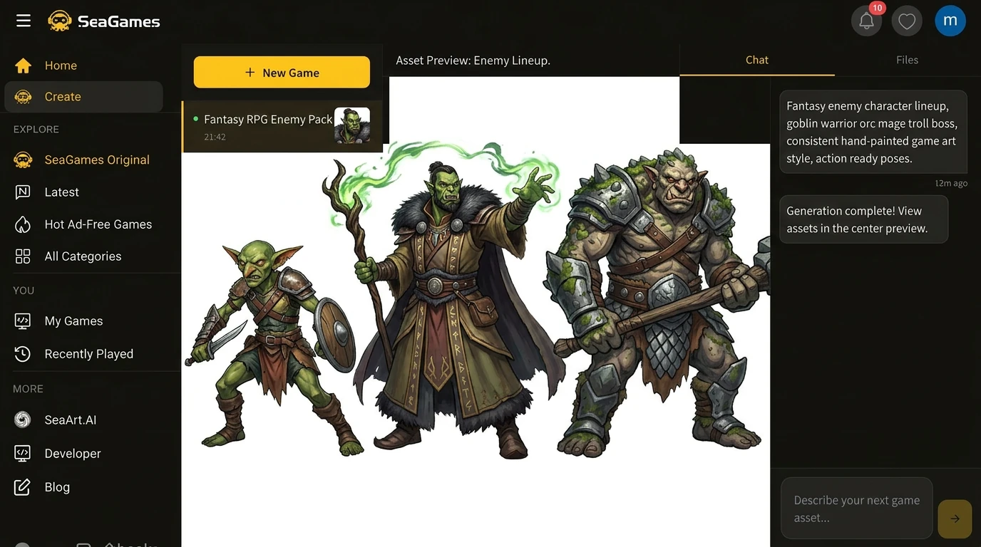 SeaGames 专为 快速迭代循环 而构建:使用 GPT Image 2 生成角色艺术,将资产放入您的项目中,在浏览器中预览,收集反馈并进行改进。 该平台以 AI 为先的工作流程意味着您不必与引擎 API 搏斗——您正在做出创意决策并立即看到结果。