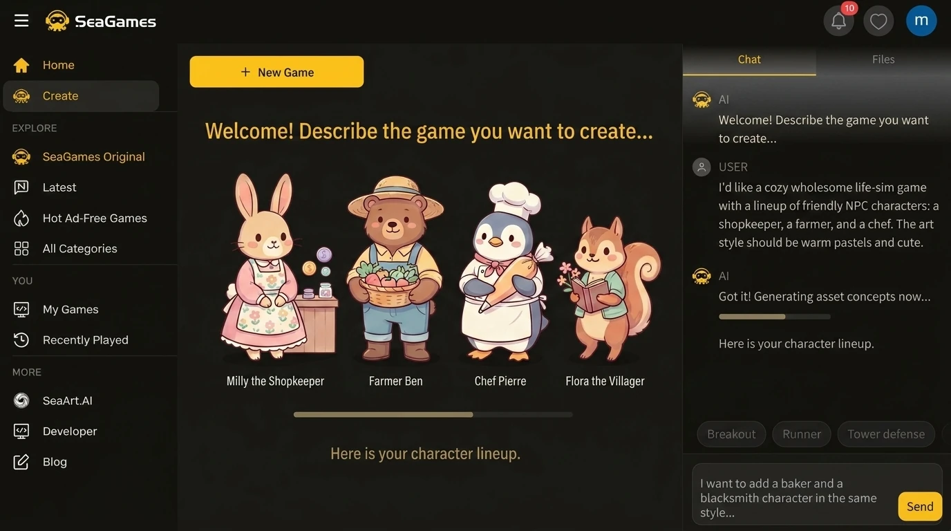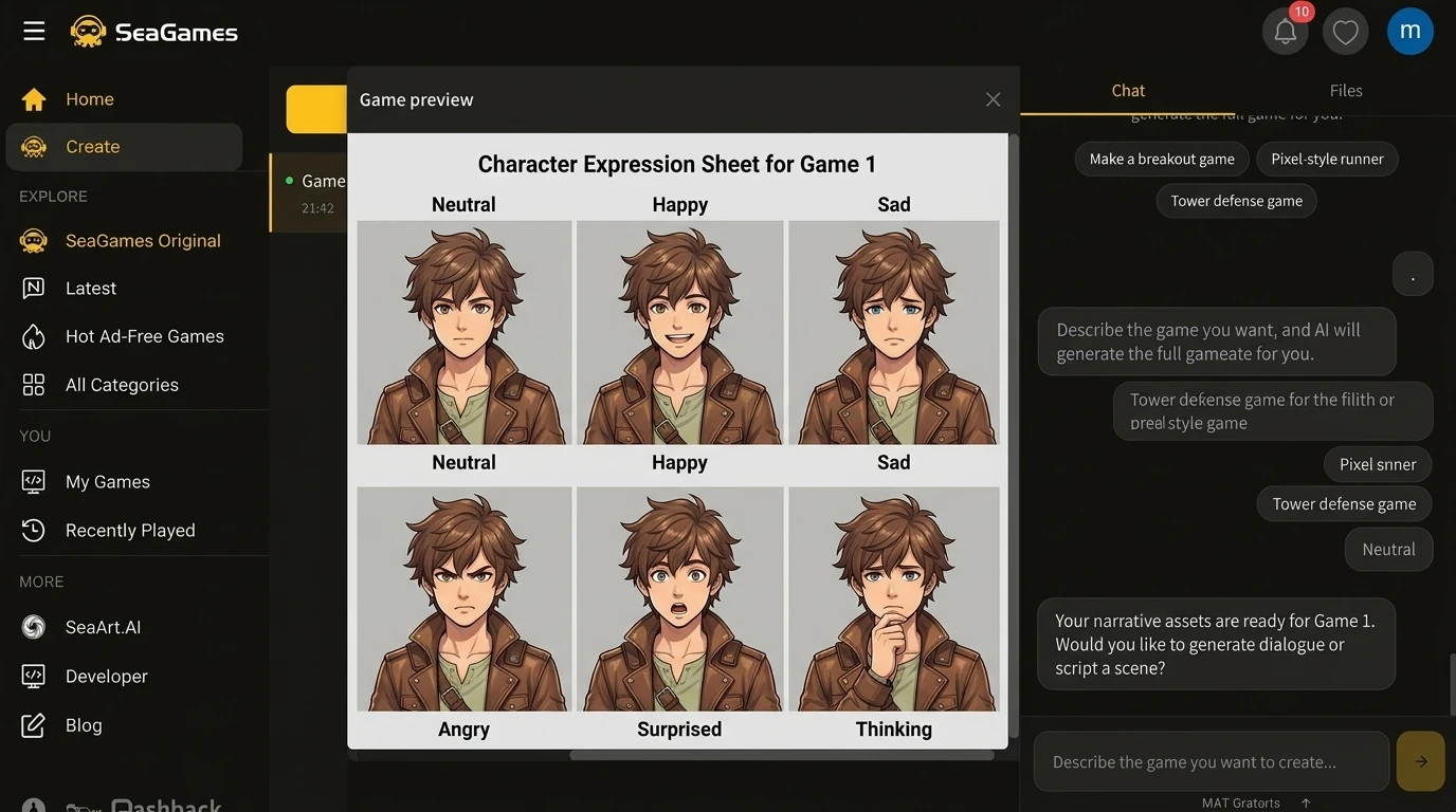 典型的创作者循环: 1) 生成基本角色设计 → 2) 导入 SeaGames 项目 → 3) 在游戏规模中测试可读性 → 4) 请求表情/姿势变体 → 5) 发布可玩片段 → 6) 观察玩家参与或弹跳的地方 → 7) 根据真实行为进行迭代。